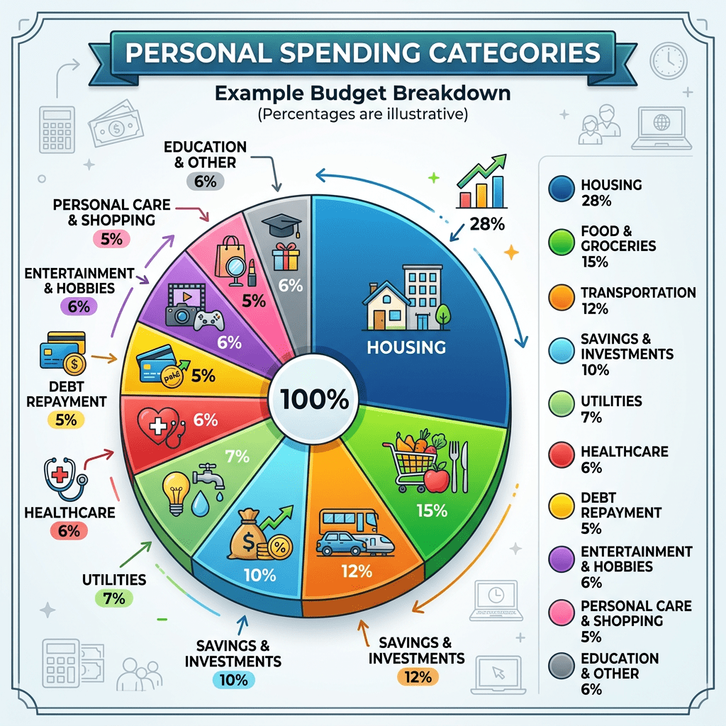 A common structure people use is the 50/30/20 rule, where income is split between needs, wants, and savings. It’s not a strict formula you have to follow—it’s just a reference point.